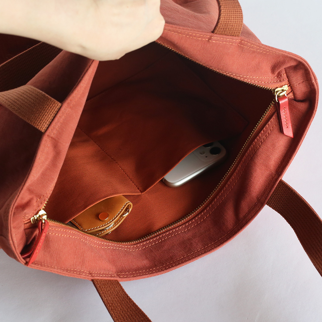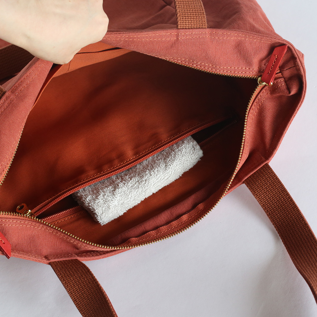 A4サイズの書類もすっぽり収まるサイズ感ながら、生地を使って立体に組み合わせた形状のため、軽量かつ、しっかりしたつくりのトートバッグです。アクティブに動き回って、持ち歩く荷物がちょっとが多めの方にはとてもおすすめ。たくさん入ってこの軽さ。この丈夫さ。一度使ったら手放せません。