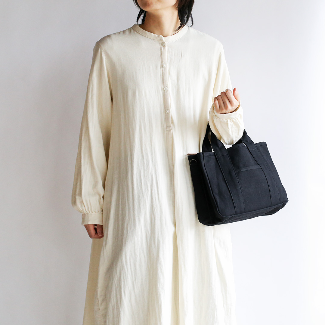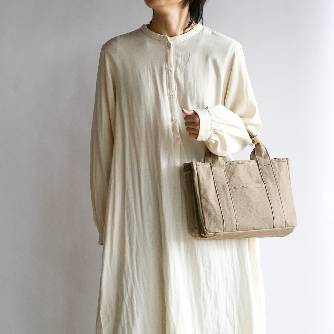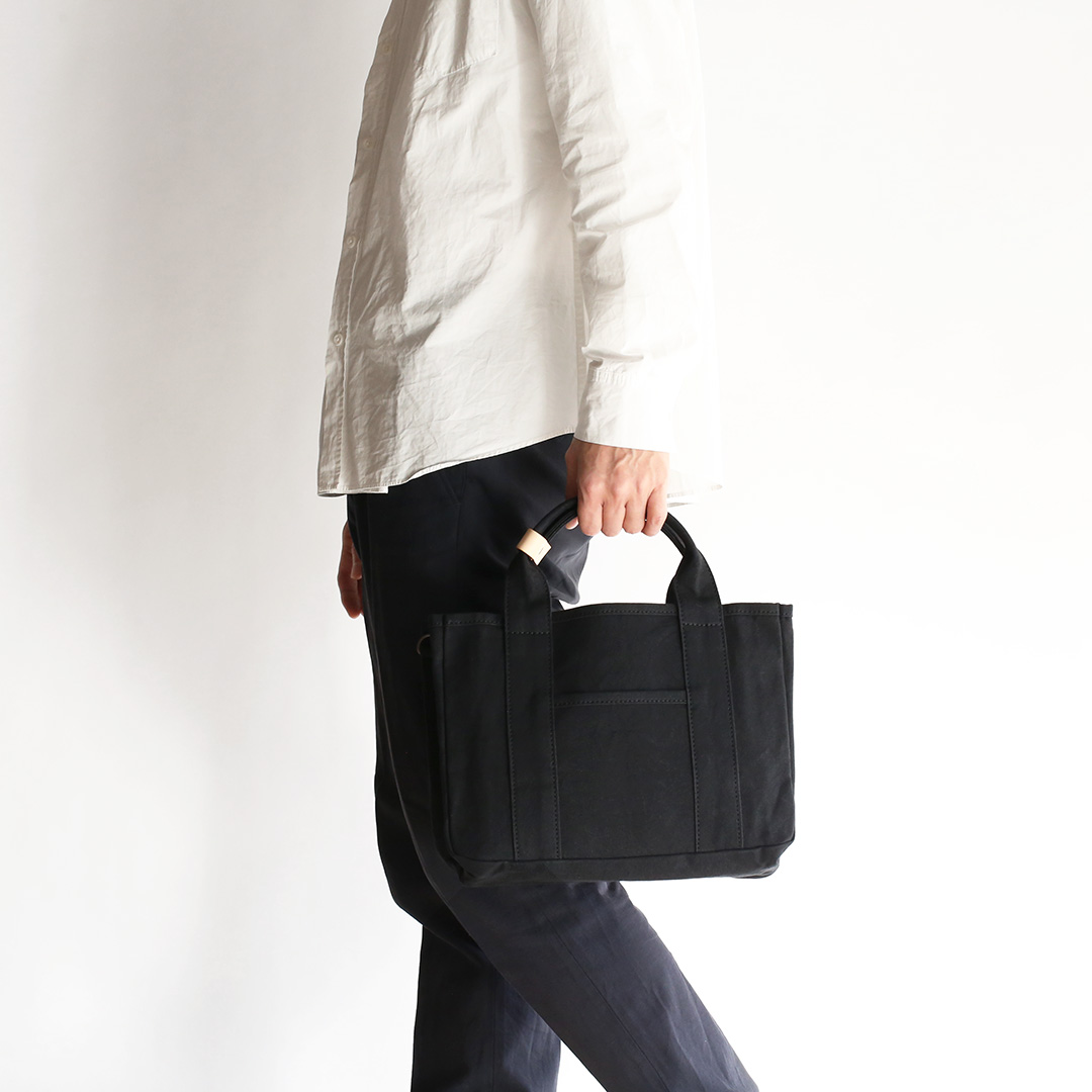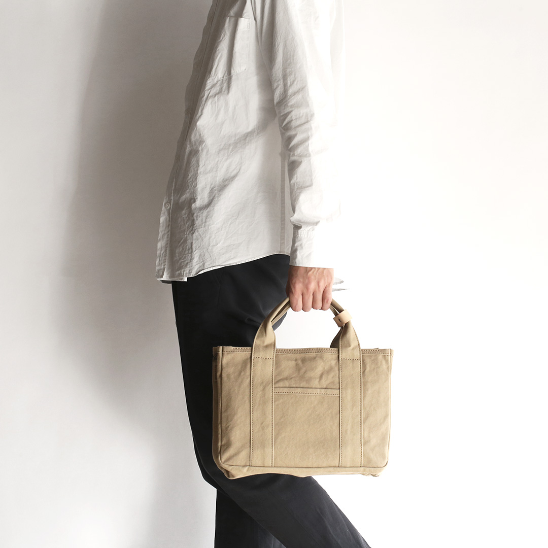 持ち手のハンドルにもバッグ本体と同じパラフィン帆布を使用し、しっかりとした握りやすい仕様に。持ち手を一つにまとめられる革ベルトがついています。ハンドル立ち上がりの高さ10cmは、手さげにちょうどよく、肩かけの際にも邪魔にならないサイズです。