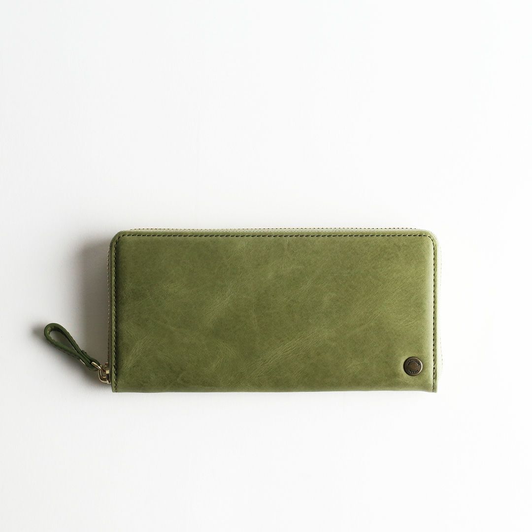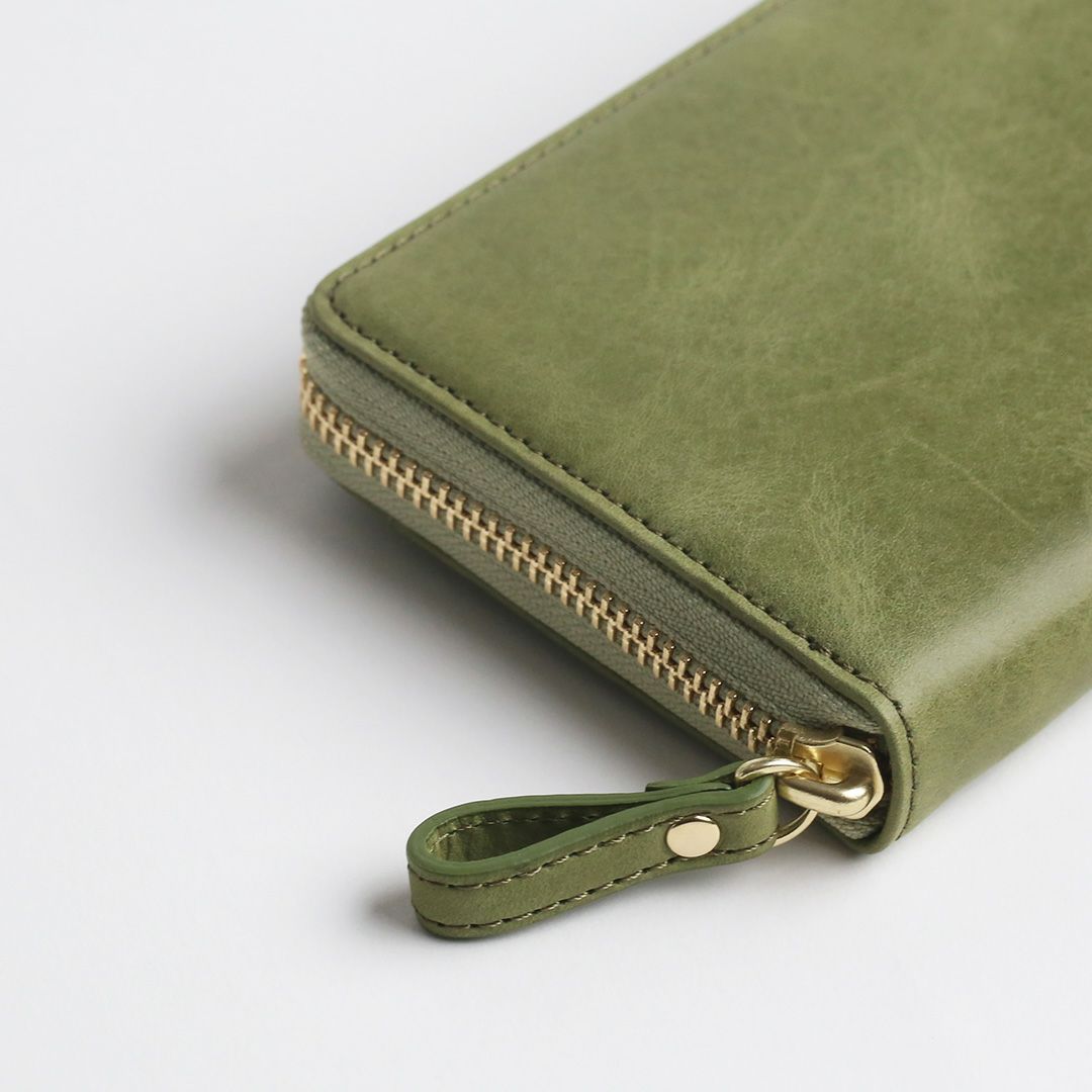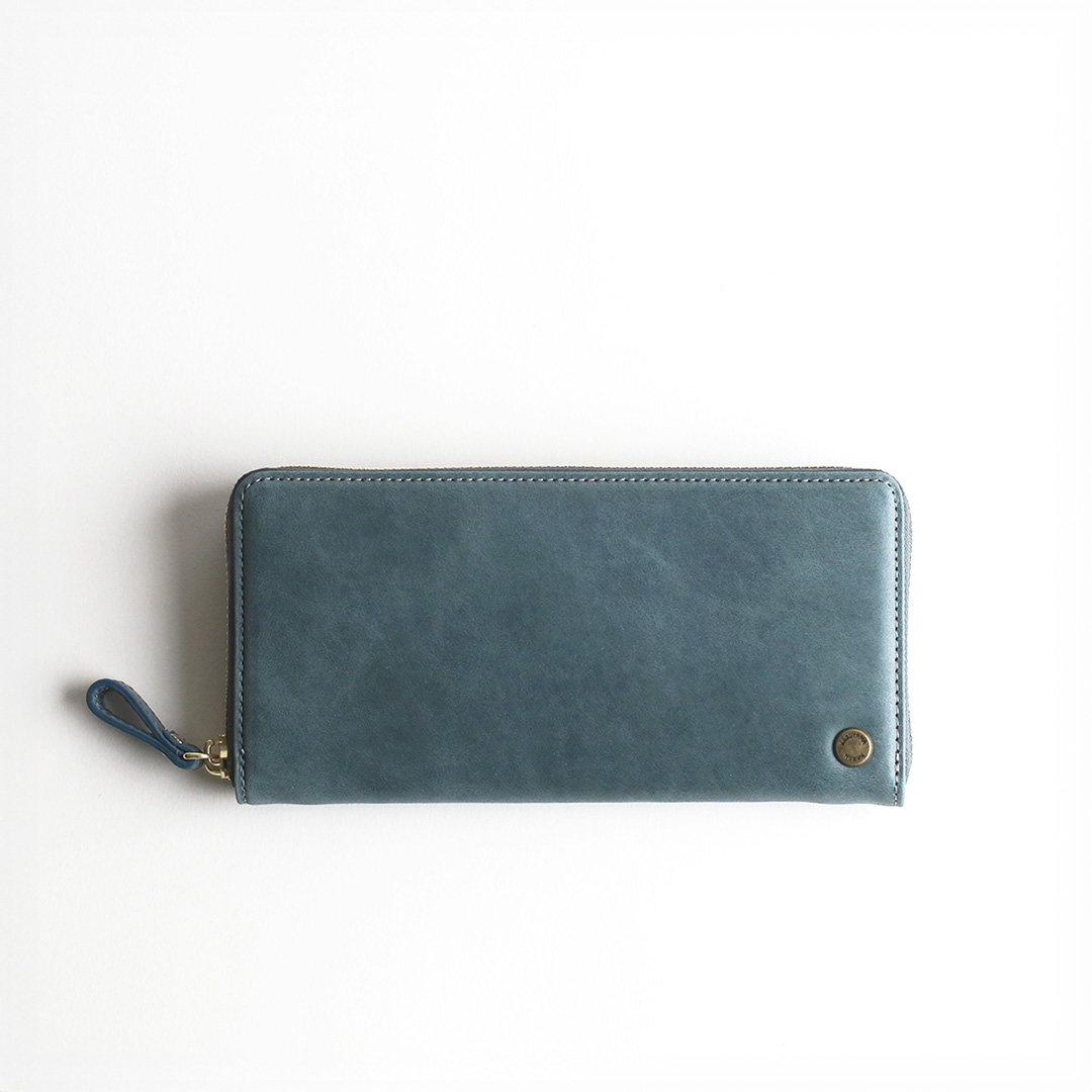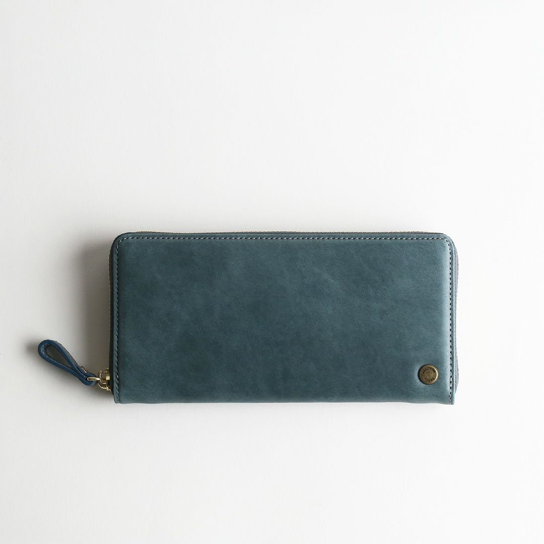 お色はスモーキーカラーの「ピンク」「グレー」「グリーン」「キャメル」「ブルー」の5色展開。柔らかで落ち着いた色合いです。女性らしい見た目の可愛さだけでなく、使いやすくて、使うほどに自分色に熟していく革の経年変化をお楽しみいただける、ちょっと欲ばり気味な革のお財布です。