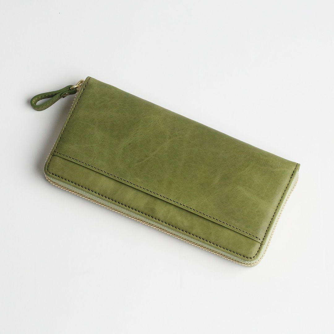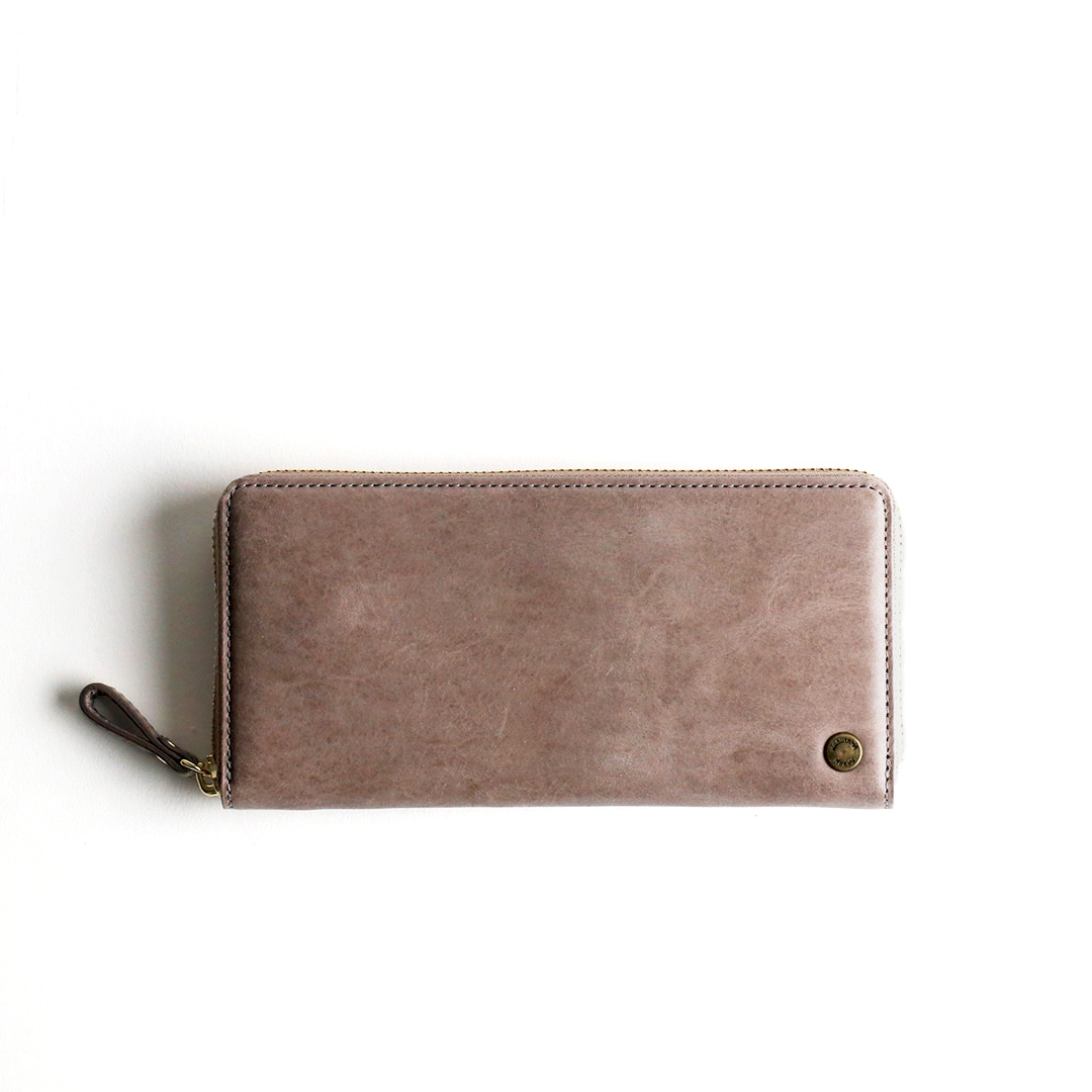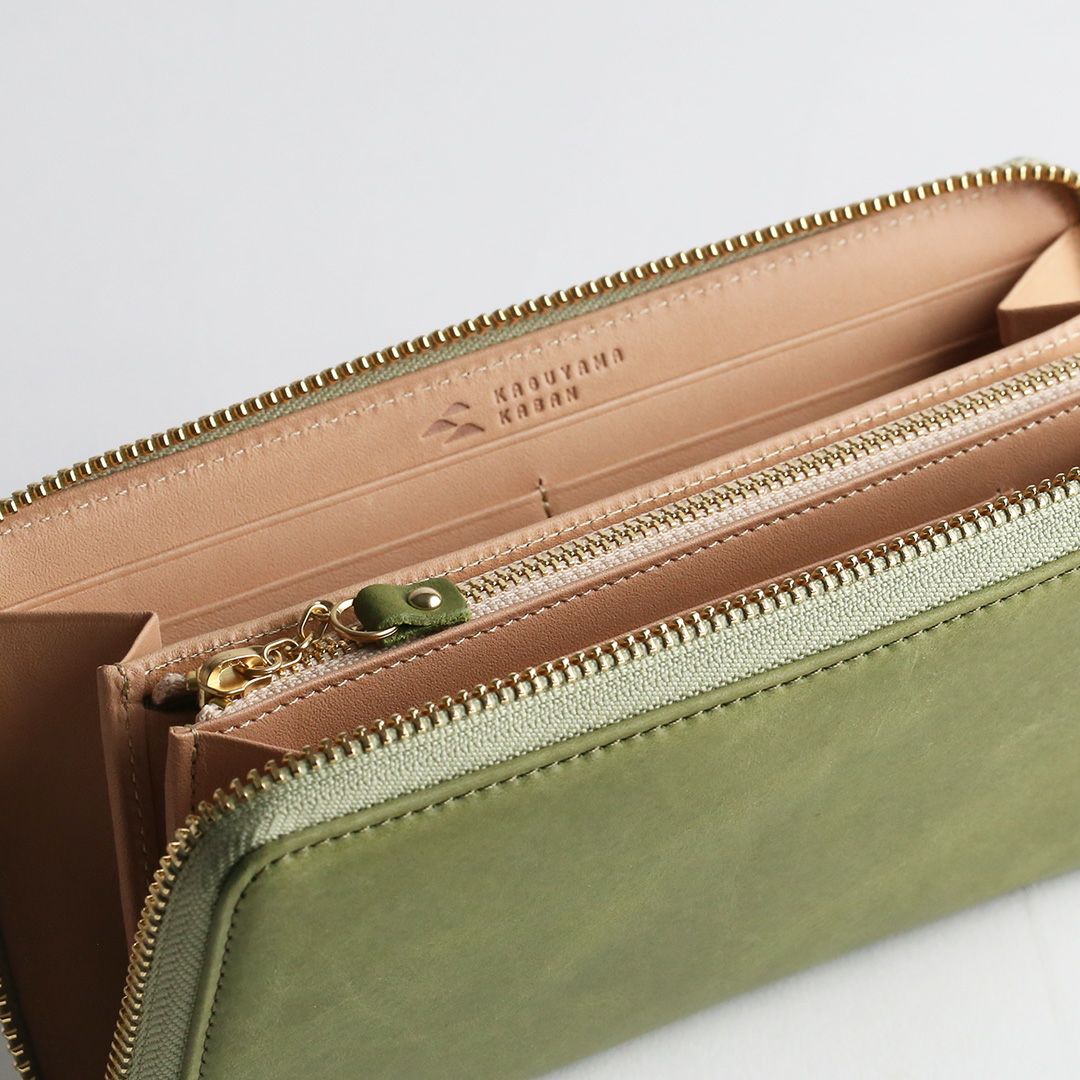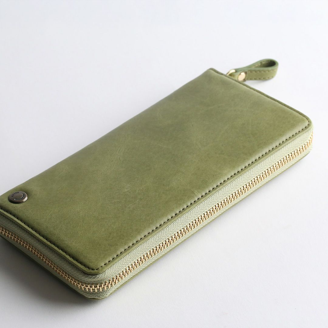 お色はスモーキーカラーの「ピンク」「グレー」「グリーン」「キャメル」「ブルー」の5色展開。柔らかで落ち着いた色合いです。女性らしい見た目の可愛さだけでなく、使いやすくて、使うほどに自分色に熟していく革の経年変化をお楽しみいただける、ちょっと欲ばり気味な革のお財布です。