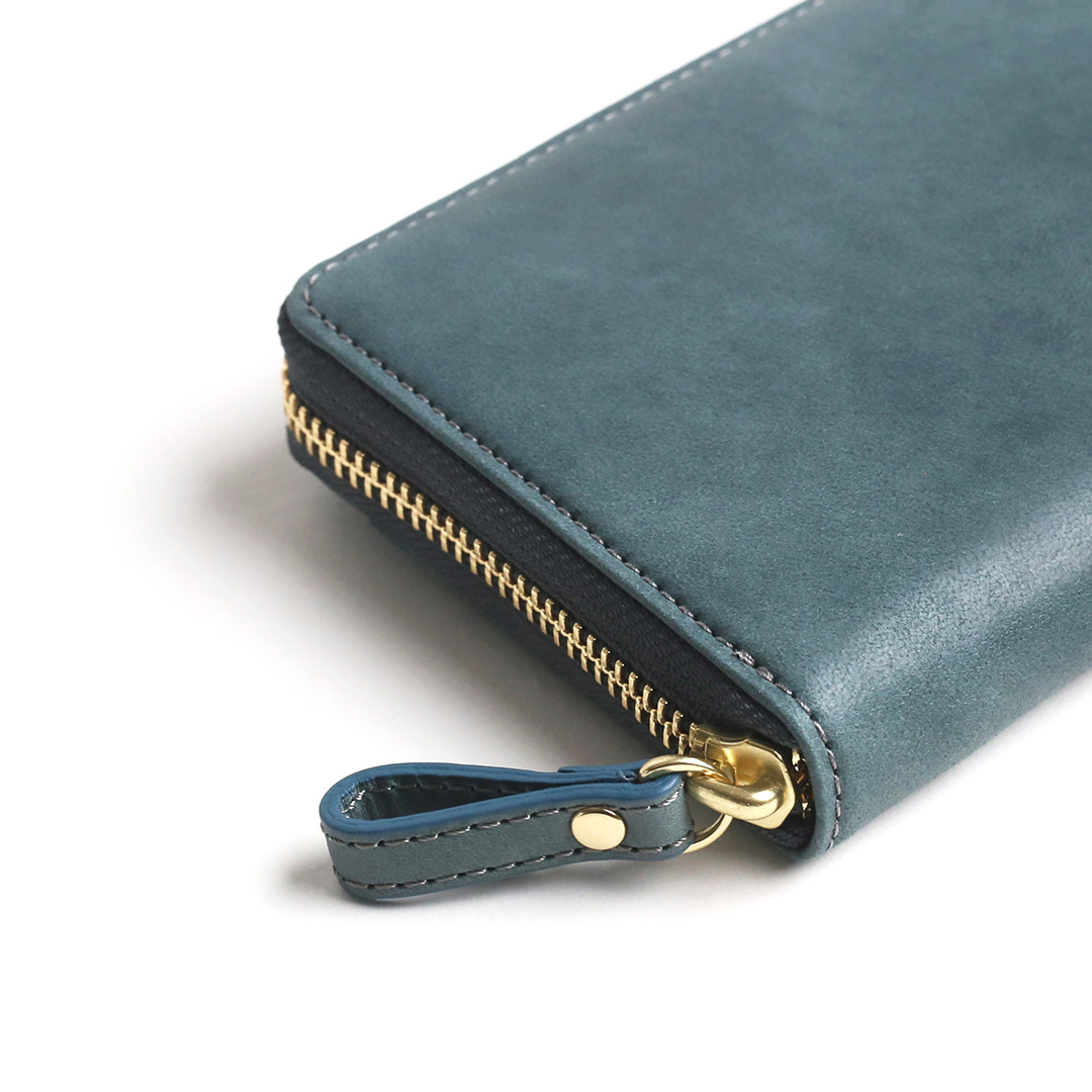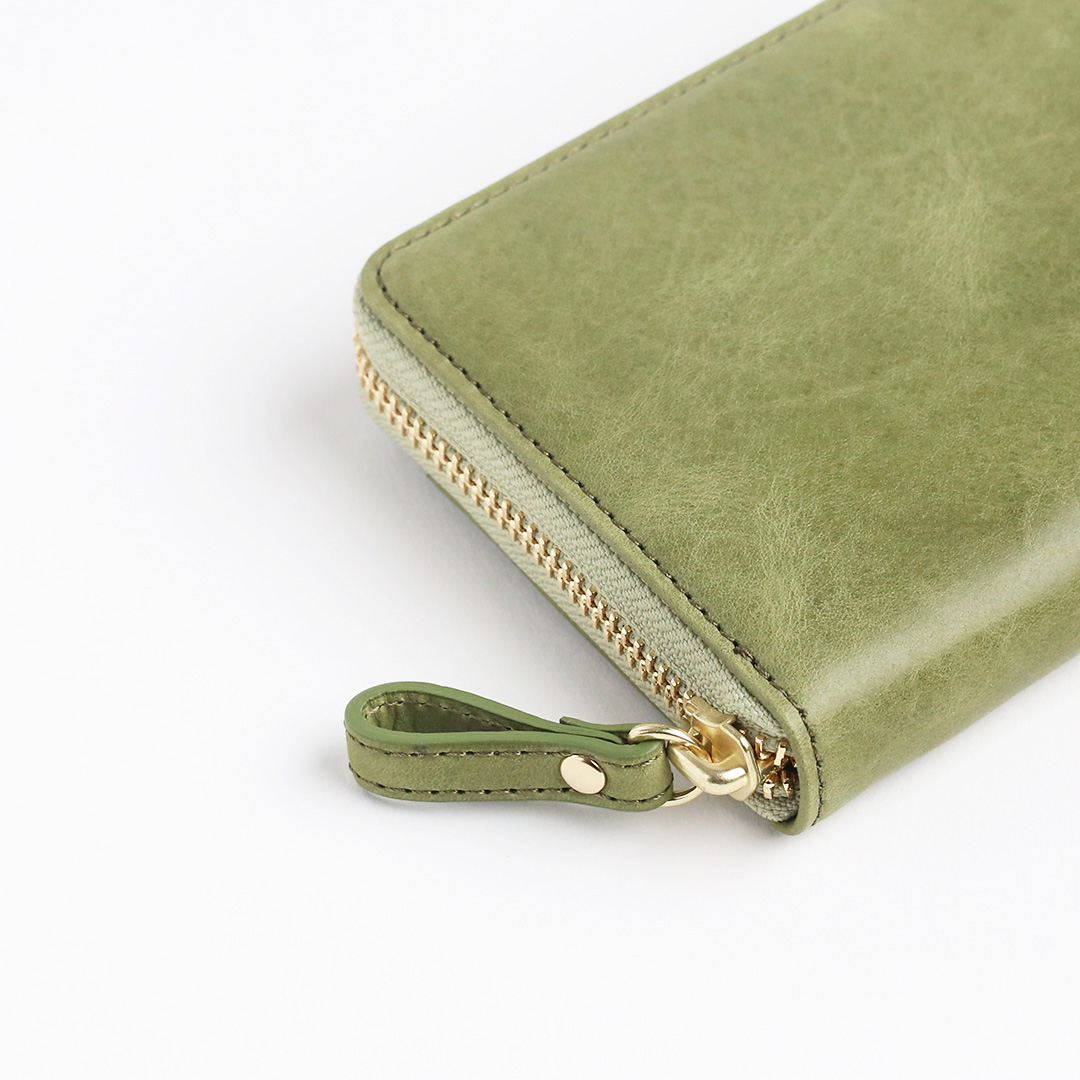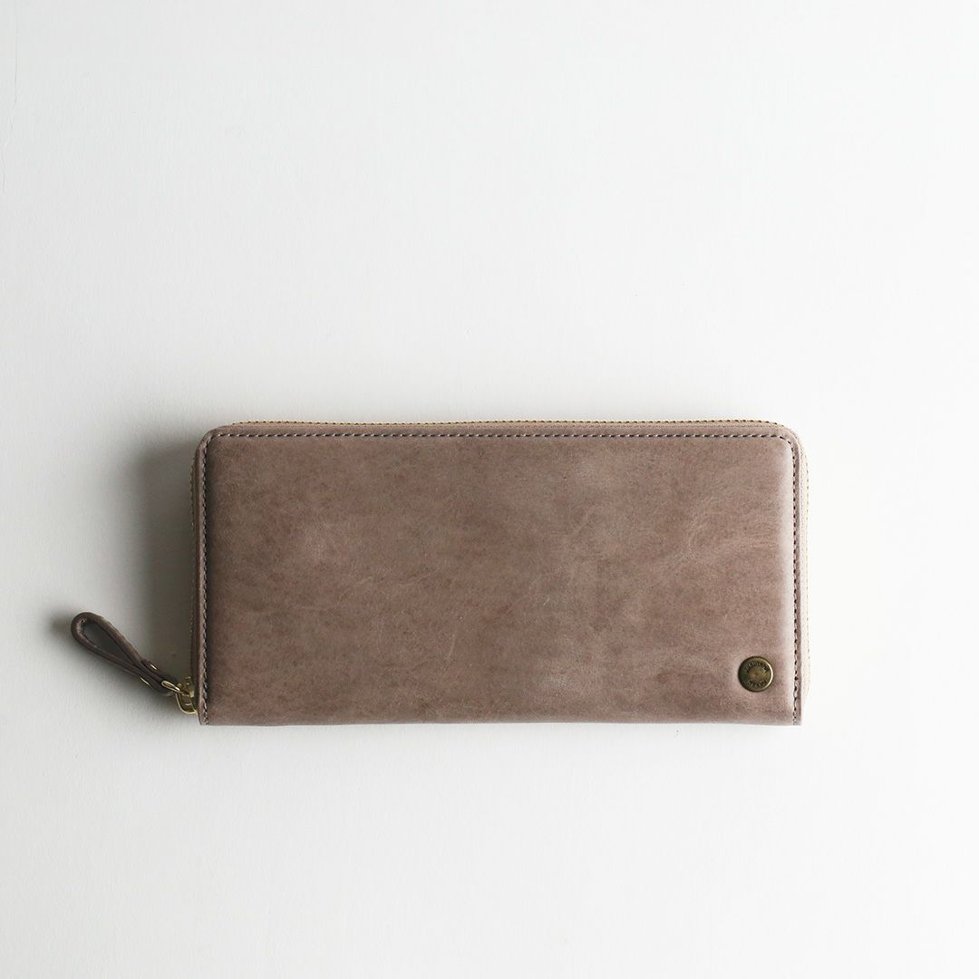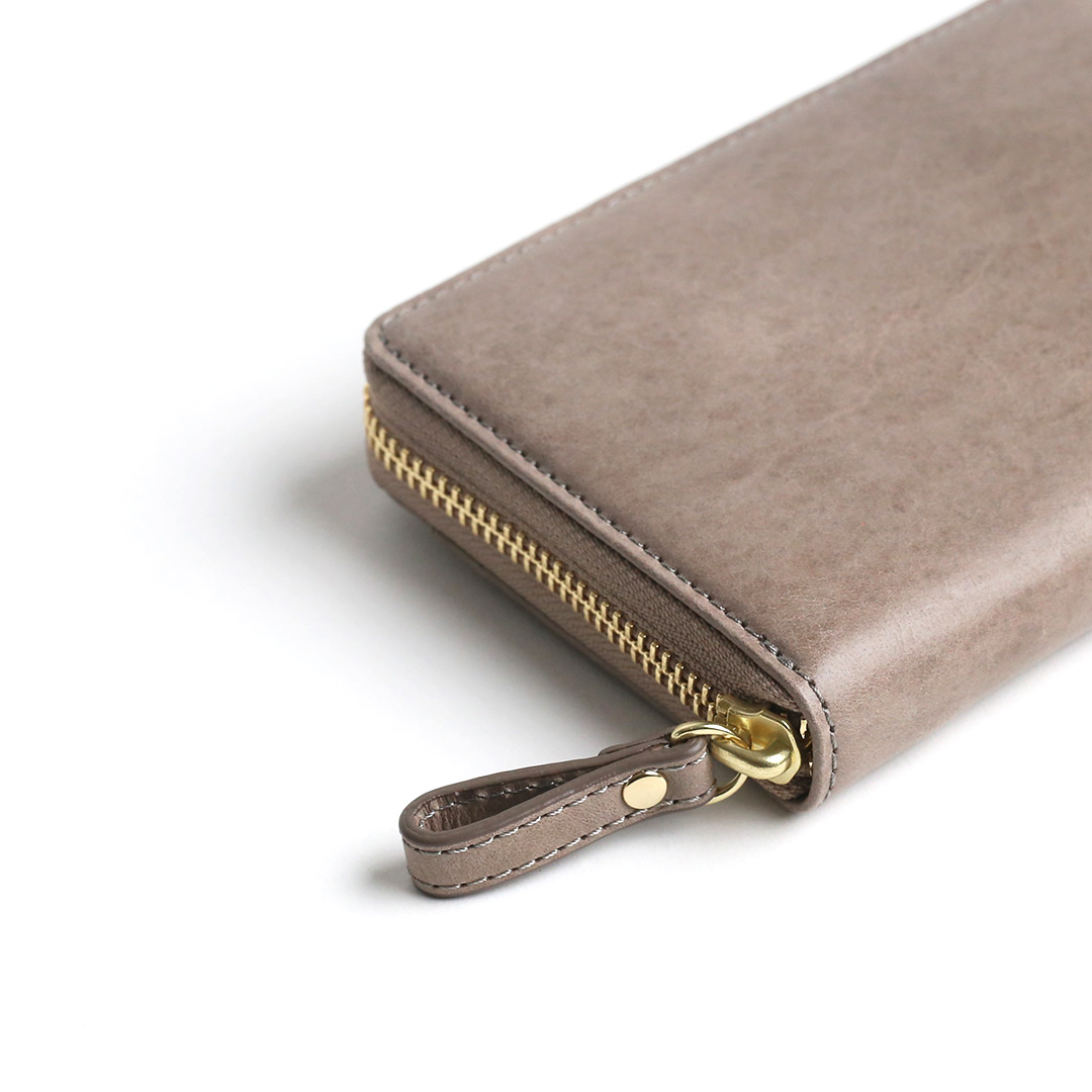 お色はスモーキーカラーの「ピンク」「グレー」「グリーン」「キャメル」「ブルー」の5色展開。柔らかで落ち着いた色合いです。女性らしい見た目の可愛さだけでなく、使いやすくて、使うほどに自分色に熟していく革の経年変化をお楽しみいただける、ちょっと欲ばり気味な革のお財布です。