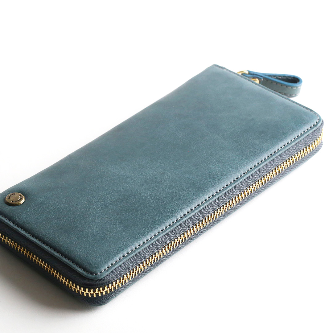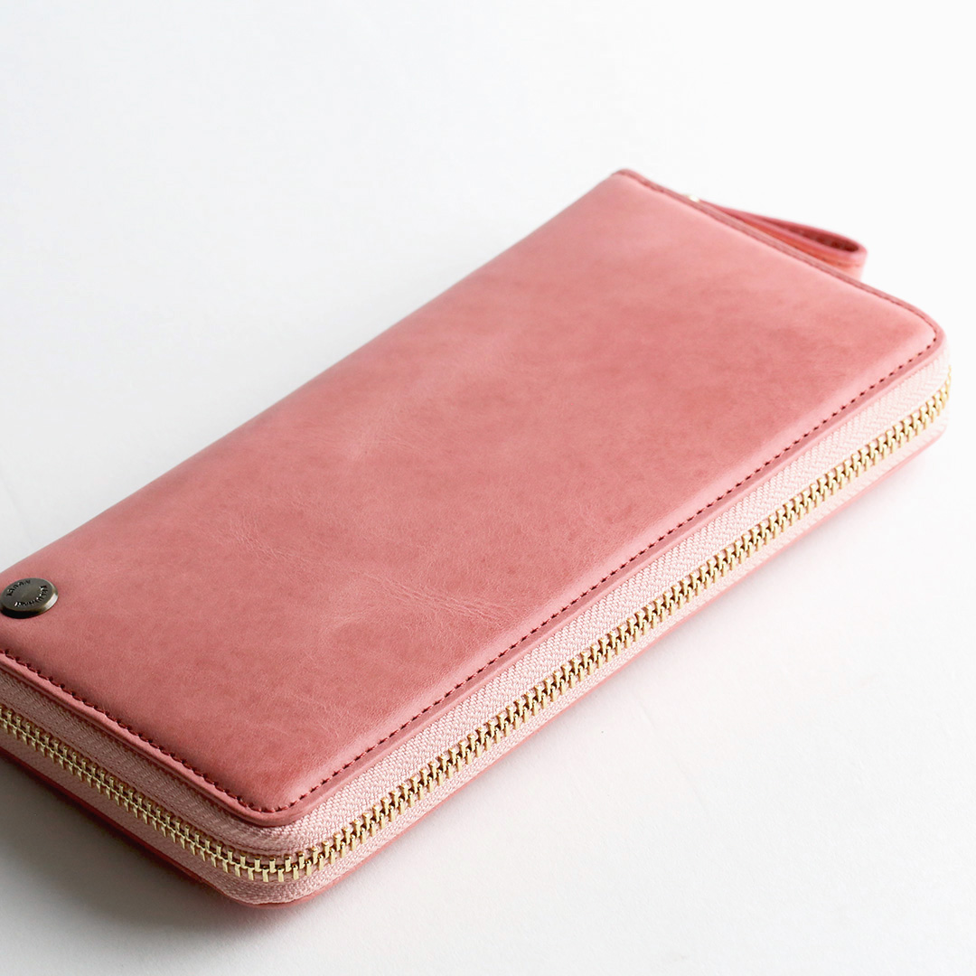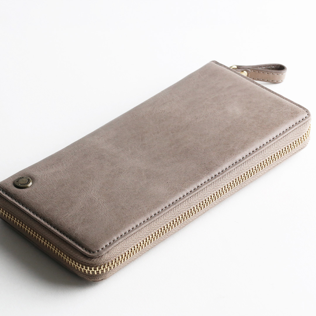 大きく開いて中が確認しやすいのが特徴のラウンドファスナータイプのお財布。ファスナーを開けると、カードポケットが12枚分、お札入れが2つ、小銭入れが1つ、ポケットが2つとシンプルな見た目以上に収納力は抜群です。なんといっても、財布の高さが9.7cmと、女性が持っても大きすぎないほどよいサイズ感でまとめている点に注目です。