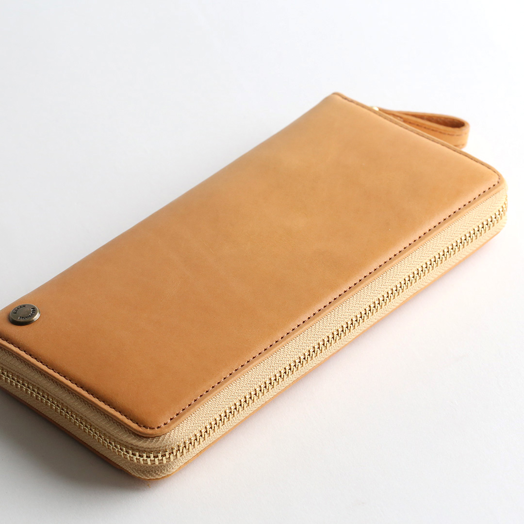 よく触ることが多い引手には、傷んでしまわないよう芯を入れ、しっかりとしたつくりに。ファスナーテープの色には、革より薄い色を使うことでカジュアルになりすぎず、柔らかで上品な雰囲気に仕上げています。