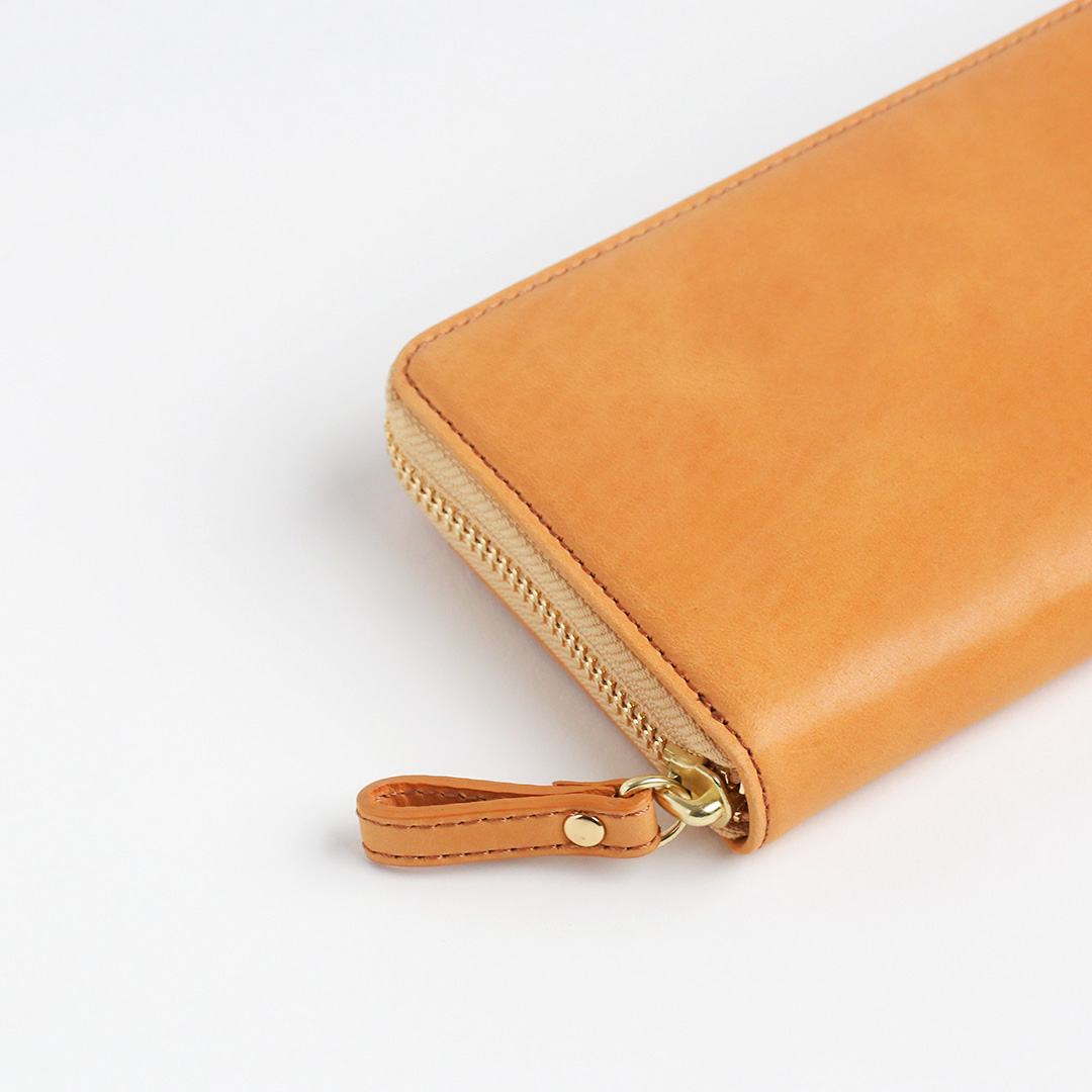 小さな革のチャームが付いた少し長めの引手です。ファスナーの開け閉めがしやすく、女性らしい印象に仕上げています。