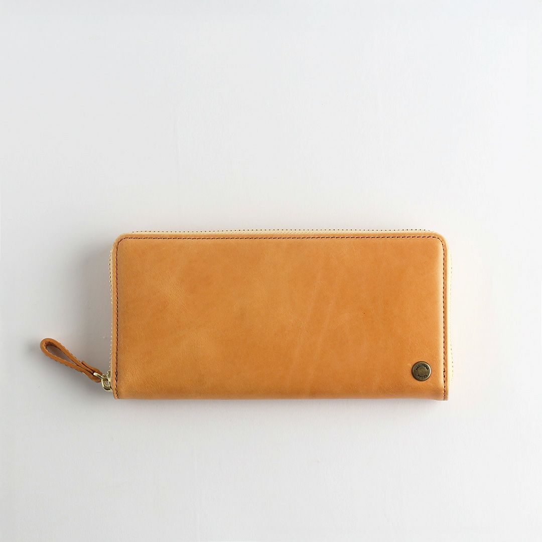 植物タンニンなめしのヌメ革を染料で染めた後、一枚一枚手塗りでワックスを塗り込み仕上げました。 使い始めはほんのりスモーキーがかった風合い。やがて表面のワックスが革の内部に染み込むことによって、輝くような艶が出てまいります。それはまるで果実が熟すことで、内より芳醇な味わいが生まれるかのよう。美しい革の経年変化が味わえます。