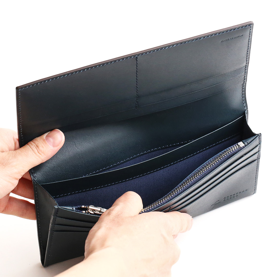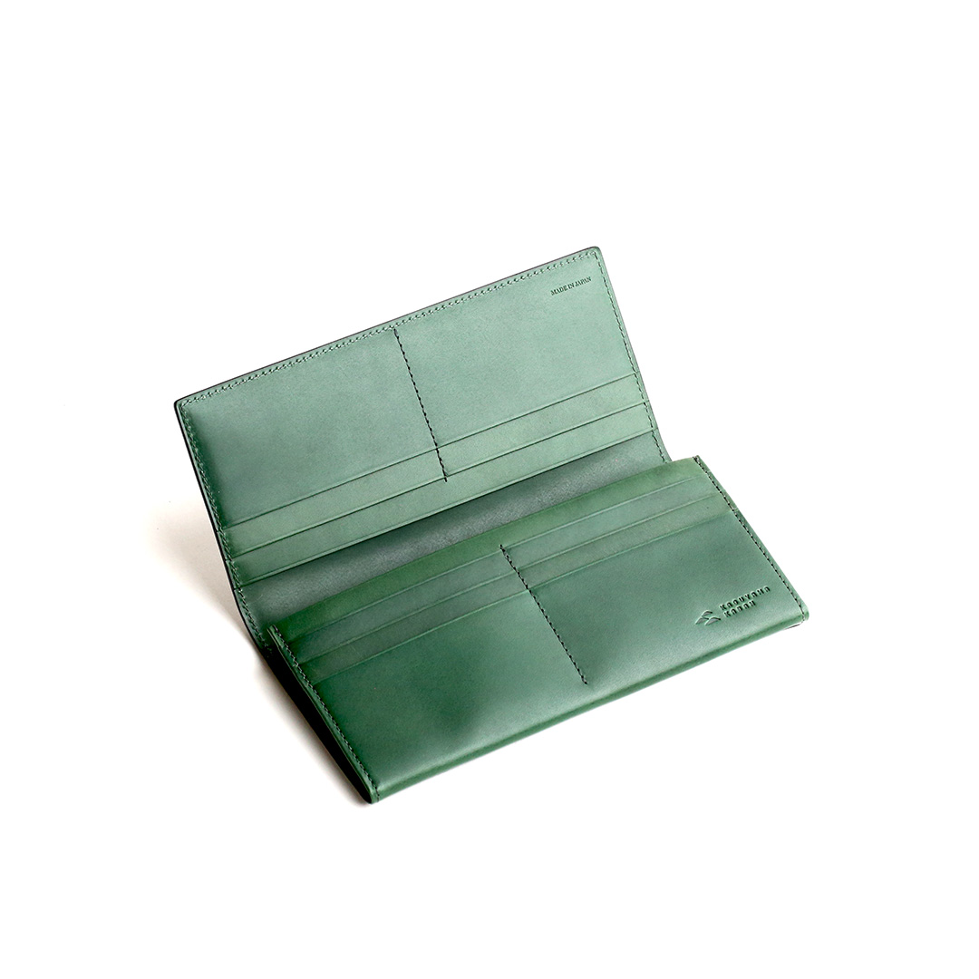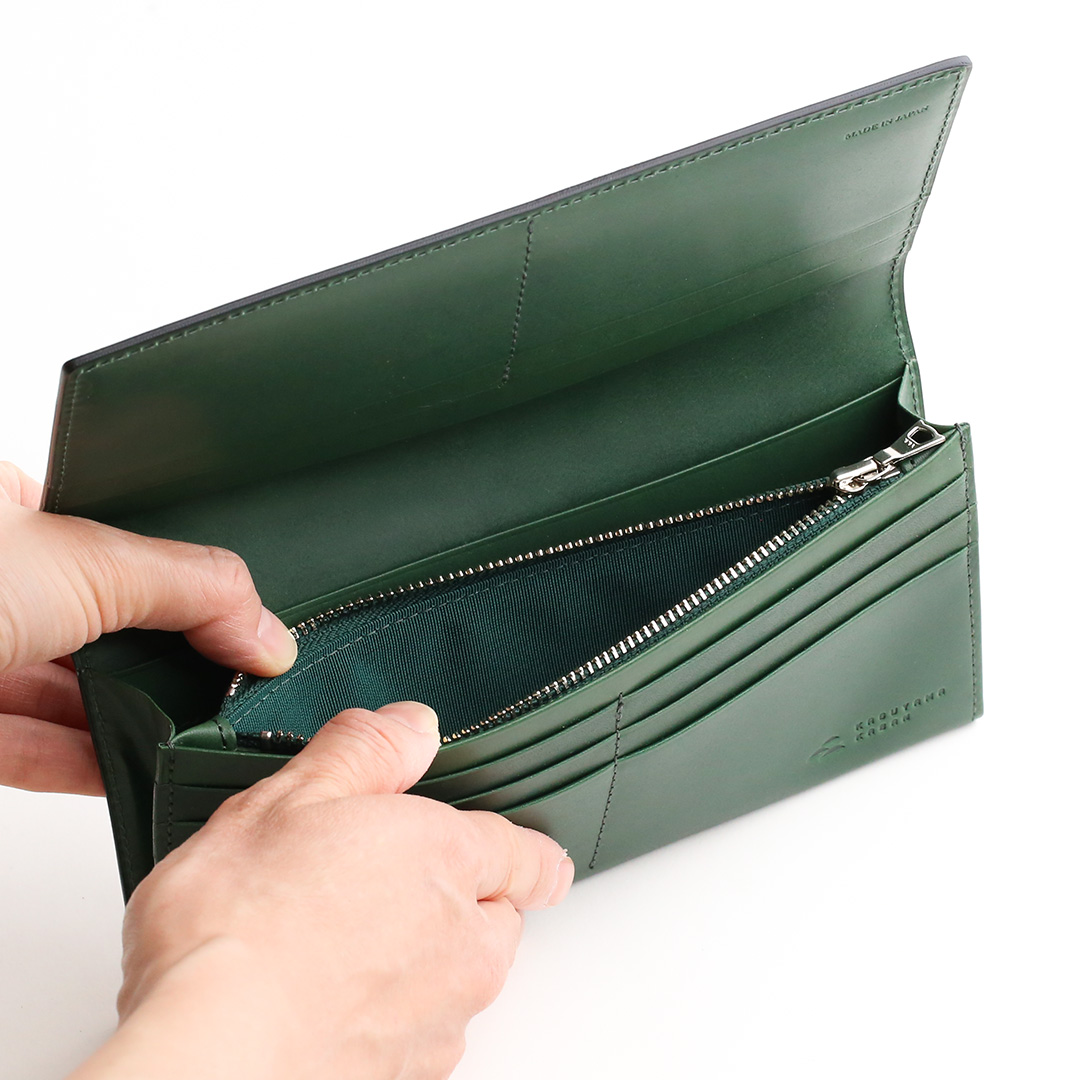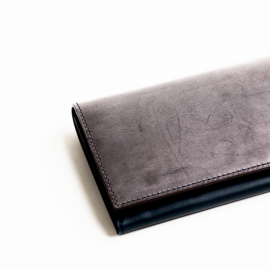 カラーは「ブラック×グリーン」と「ダークブラウン×ネイビー」の2色展開です。表側と内側の配色は、開け閉めの折にふと目を惹きつける鮮やかさがありながらも、落ち着いた色調でまとめることでフォーマルな場にも馴染むバランスに仕上げています。月日が経つほどに味わいが深まり、それぞれの革の経年変化を楽しめます。
