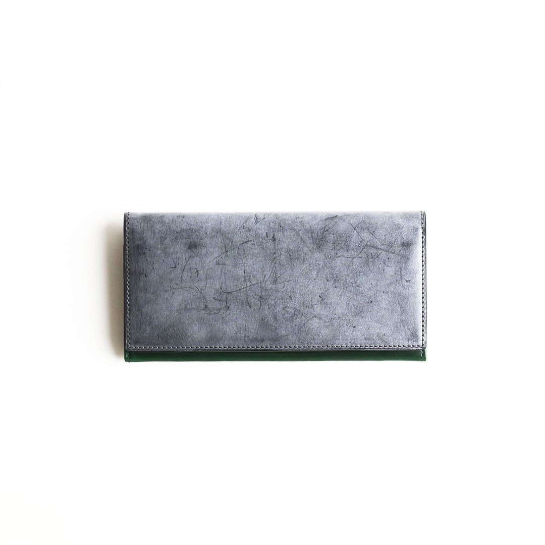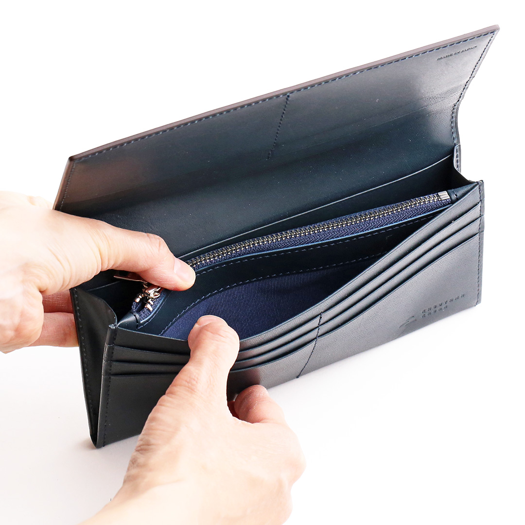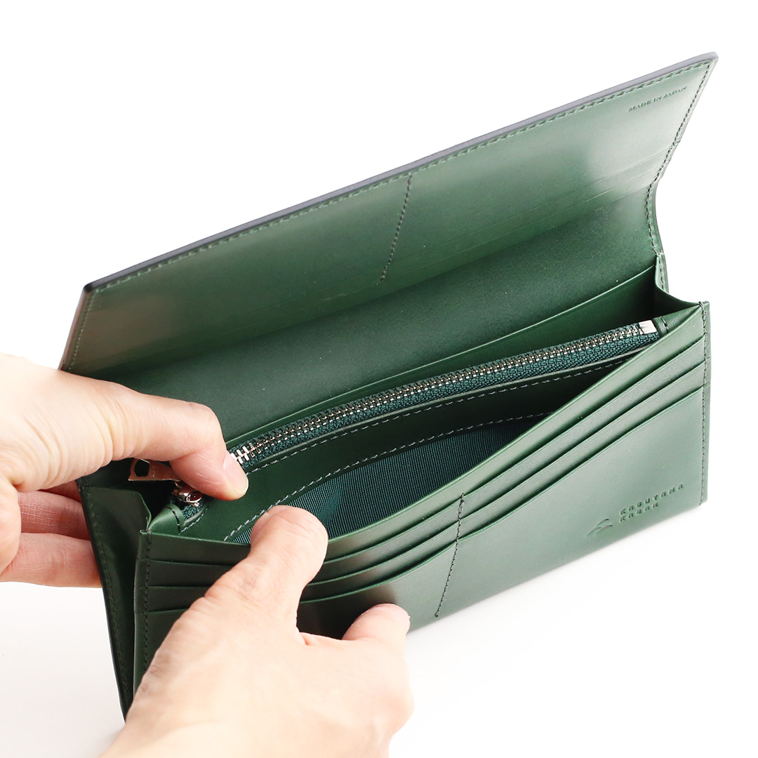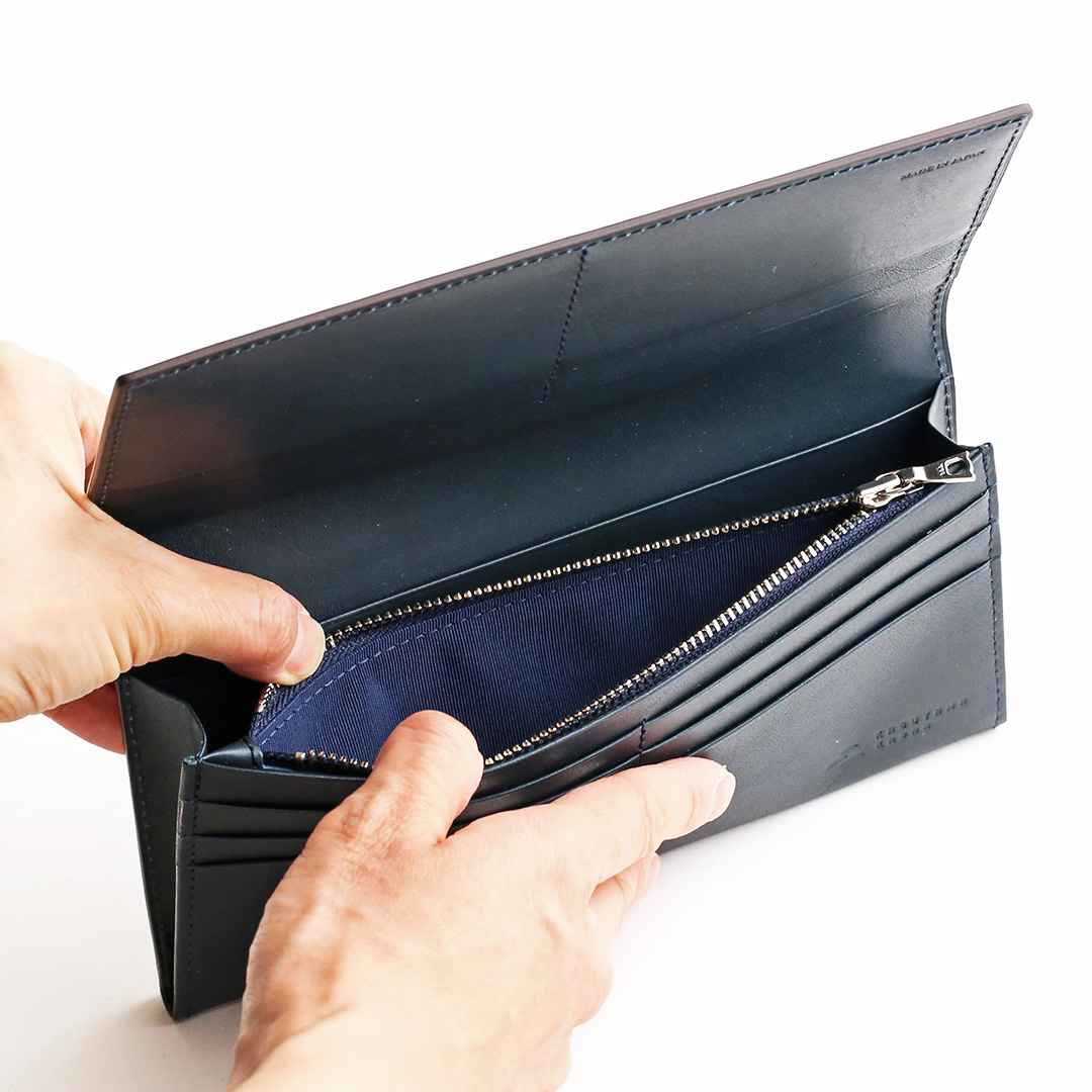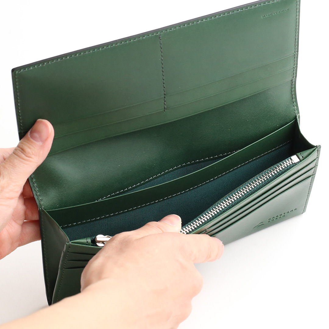カラーは「ブラック×グリーン」と「ダークブラウン×ネイビー」の2色展開です。表側と内側の配色は、開け閉めの折にふと目を惹きつける鮮やかさがありながらも、落ち着いた色調でまとめることでフォーマルな場にも馴染むバランスに仕上げています。月日が経つほどに味わいが深まり、それぞれの革の経年変化を楽しめます。