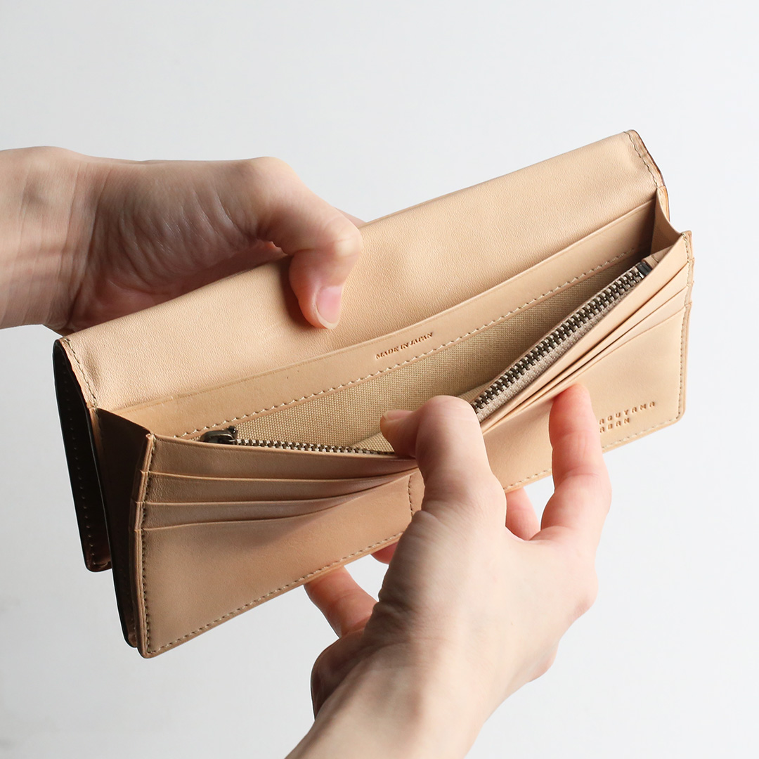 外にファスナーが付いていない分、ラウンド型の長財布よりスマートです。でも、収納量を削減したわけではありません。カードは13枚分収納できますので、使用頻度の高い1軍カードはもちろん、もうすぐ2軍に上がるというような3軍カードも収納できます。