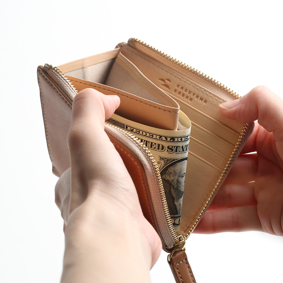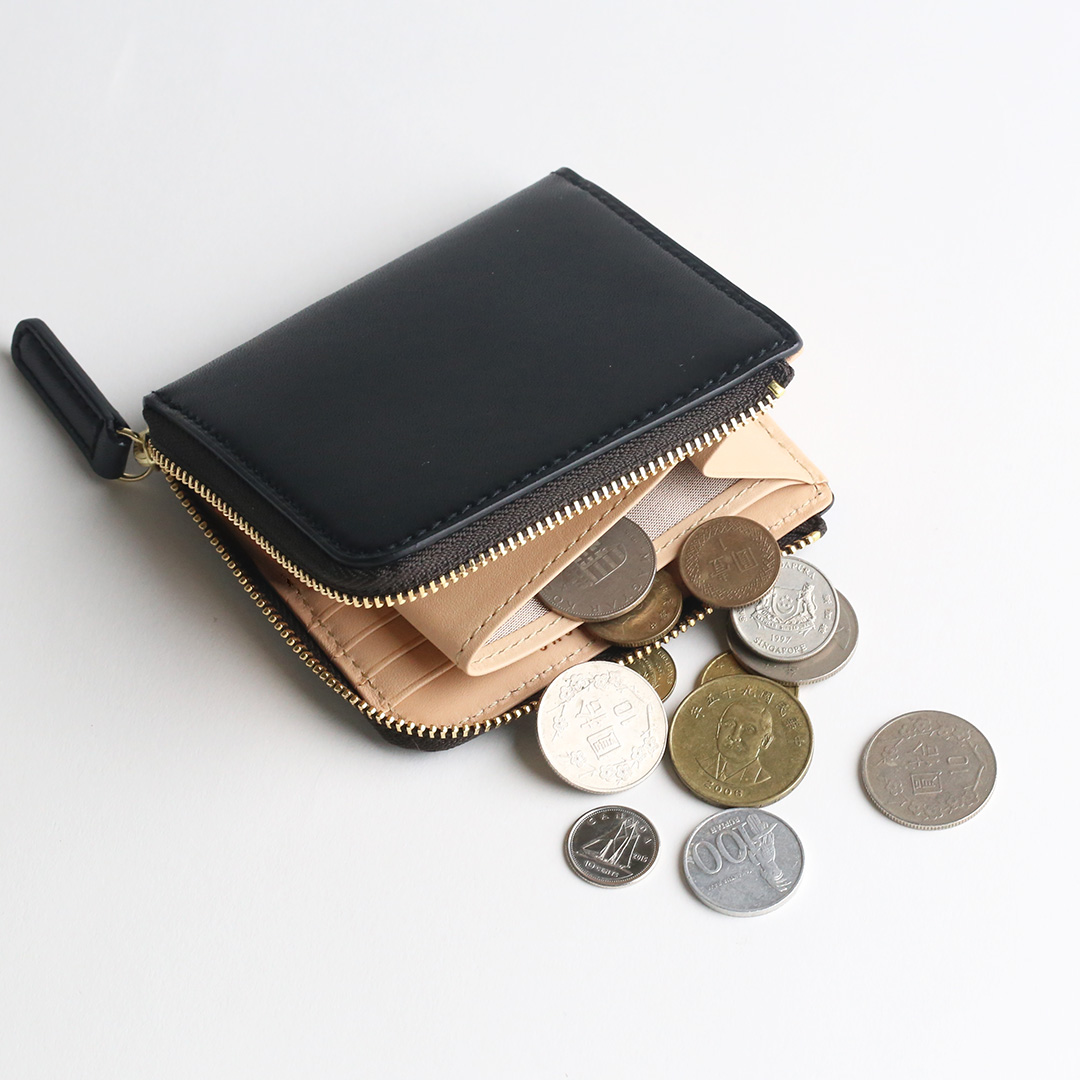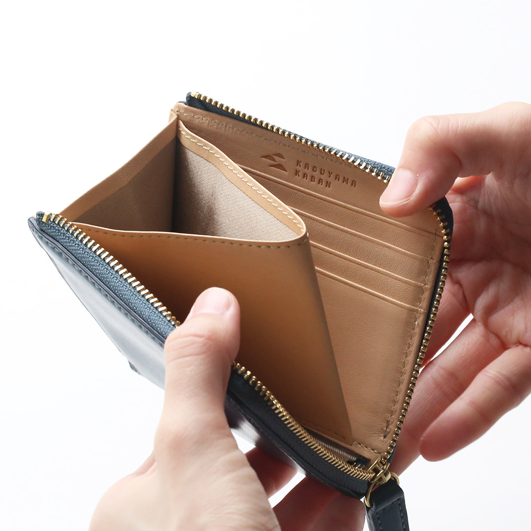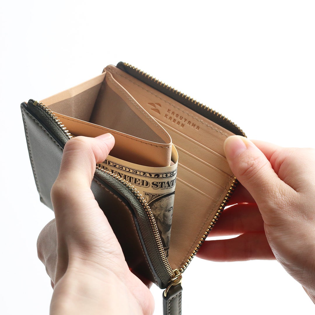 Lファスナーのお財布は収納が大きく開き、中が見やすく取り出しやすいのが特長です。中心には大きなマチ付きのコイン収納を備え、お札を券種ごとに管理したい場合には仕切り代わりにもなります。 また仕切りを囲うように重ねて収納すれば、お札を折らずに収納することもできます。