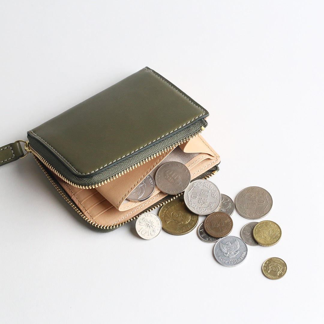 裁断・縫製まですべての工程を日本国内で一貫製造した、ヌメ革のLファスナータイプのミニウォレットです。