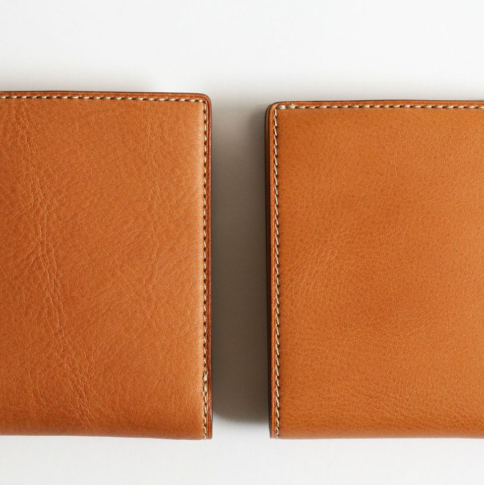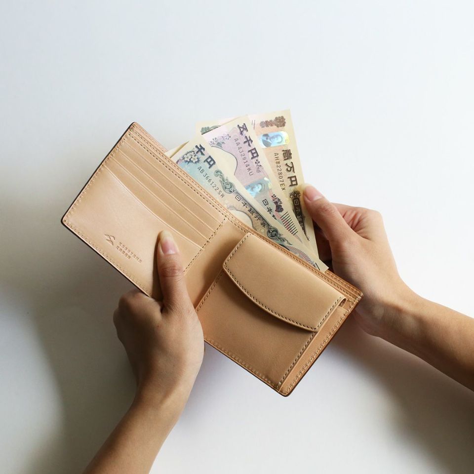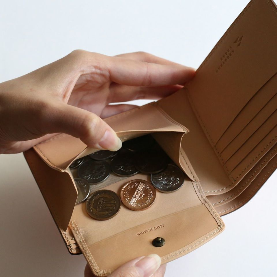 お札入れの部分は二層式。お札の種類を分けて使っても、レシートや領収書入れとして活用するのも良いですね。二層あれば、使いたいように使える自由があります。また、コインケースはBOX型ではなくポケット型。硬貨が入ってもある程度の膨らみは抑えられてスリムに使える、そんなところも二つ折り財布の良きところ。
