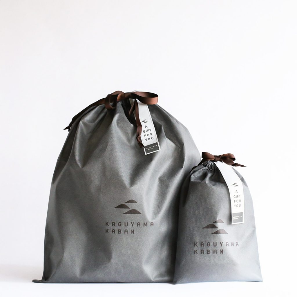 巾着型の袋に香久山鞄のロゴをあしらったオリジナルデザインで、リボンは落ち着いたブラウン色です。リボンには、「A GIFT FOR YOU」と記したメッセージタグを添えてお包みいたします。